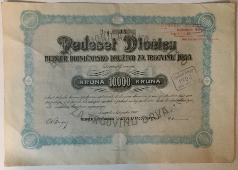 PEDESET DIONICA, BERGER DIONIČARSKO DRUŽTVO ZA TRGOVINU DRVA, ZAGREB, BROJ 14, VRIJEDNOST 10.000 KRUNA, 1907. GOD.