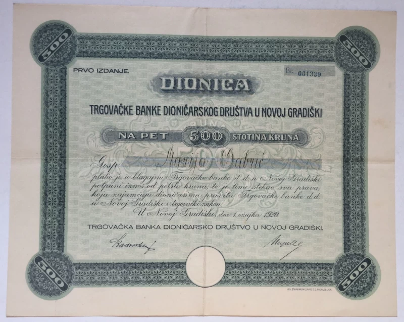 STARA DIONICA TRGOVAČKE BANKE DIONIČARSKOG DRUŠTVA U NOVOJ GRADIŠKI 500 KRUNA 1920 NOVA GRADIŠKA