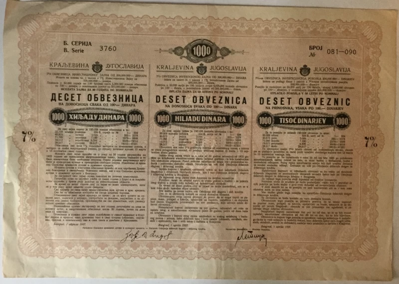 Nepoznati autori: DESET OBVEZNICA , 7% OBVEZNICA INVESTICIONOG ZAJMA OD 500,000.000 DINARA. KRALJEVINA JUGOSLAVIJA, SERIJA 3760 BROJ 081-090, VRIJEDNOST OBVEZNICE 100 DINARA, UKUPNO TISUĆU DINARA, 1937. GOD.