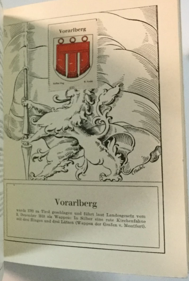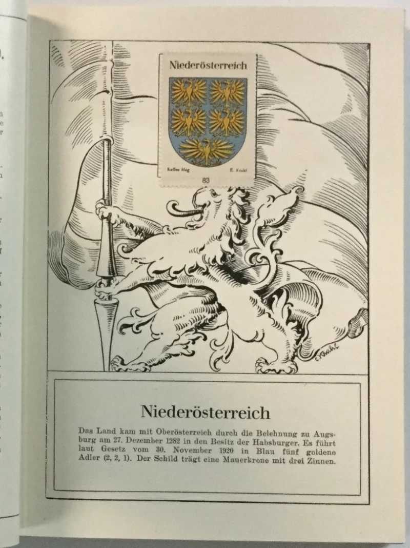 The album Die Wappen der Republik Oesterreich was issued in 1931 in Graz. The author was F. Hasslinger. Two different versions of the album were published; a small edition and a luxury edition. The luxury edition came in a cardboard cage and had one additional page with the Austrian National arms. The album contains 450 (luxury) images, which are numbered from 1 to 449. The national arms has no number. The album is divided in chapters per State, with the State arms on a separate page, followed by the capital city and, alphabetically, the other towns and cities in the State. The exception is the State of Burgenland, from which no town arms were published
