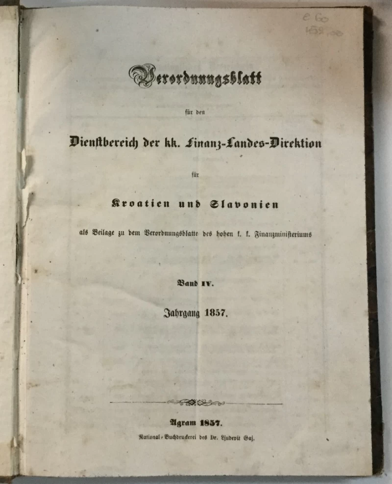 Nepoznati autori: Verordnungsblatt für den Dienstbereich der k . k . Finanz - Landesdirektion für Kroatien und Slavonien Band IV. Jahrgand 1857.