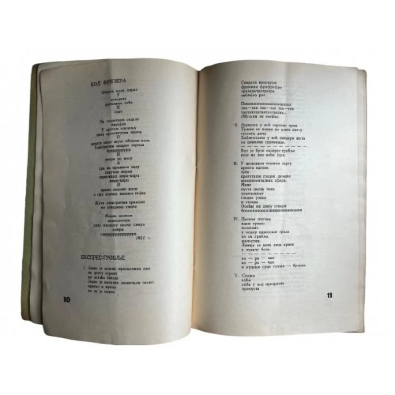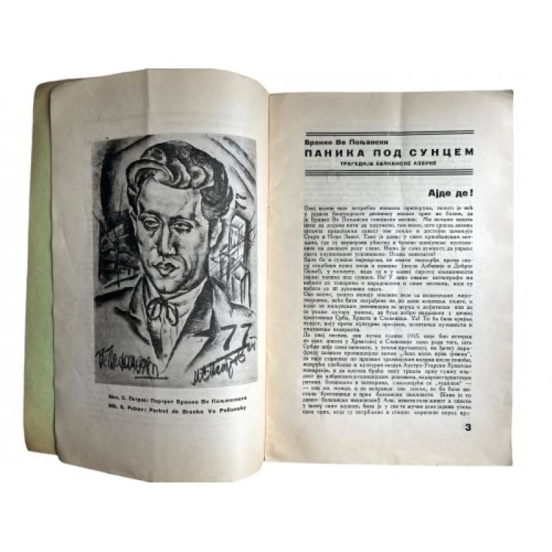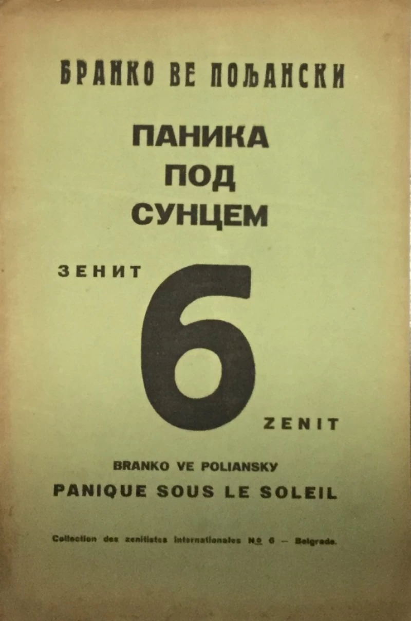 | Pismo | Latinica i ćirilica Prvo izdanje – numerirano izdanje br. 6/30. Sa potpisom autora. Avangarda i nadrealizam. Branko Ve Poljanski, pravim imenom Branislav Virgilije Micić, pjesnik i slikar, s bratom Ljubomirom Micićem vođa srpsko-hrvatskog avangardnog (nadrealističkog i antidadaističkog) pokreta zenitizam. Ukupno četrdeset tri broja časopisa punog naziva „Zenit – internacionalna revija za umetnost i kulturu“, izlazila su od veljače 1921. do prosinca 1926. godine. `Zenit je časopis koji je izlaziou Zagrebu i Beogradu kao "Međunarodna revija za umetnost i kulturu". Na početku rada, sa ovim časopisom surađivali su Miloš Crnjanski, Dušan Matić, Stanislav Vinaver i drugi. Priloge su objavljivali i međunarodni suradnici Aleksandar Blok, Jaroslav Sajfert, Vasilij Kandinski, Anri Barbis… Zenit se od 1924. objavljuje u Beogradu, a 1926. godine je zabranjen zbog teksta „Zenitizam kroz prizmu marksizma.` |