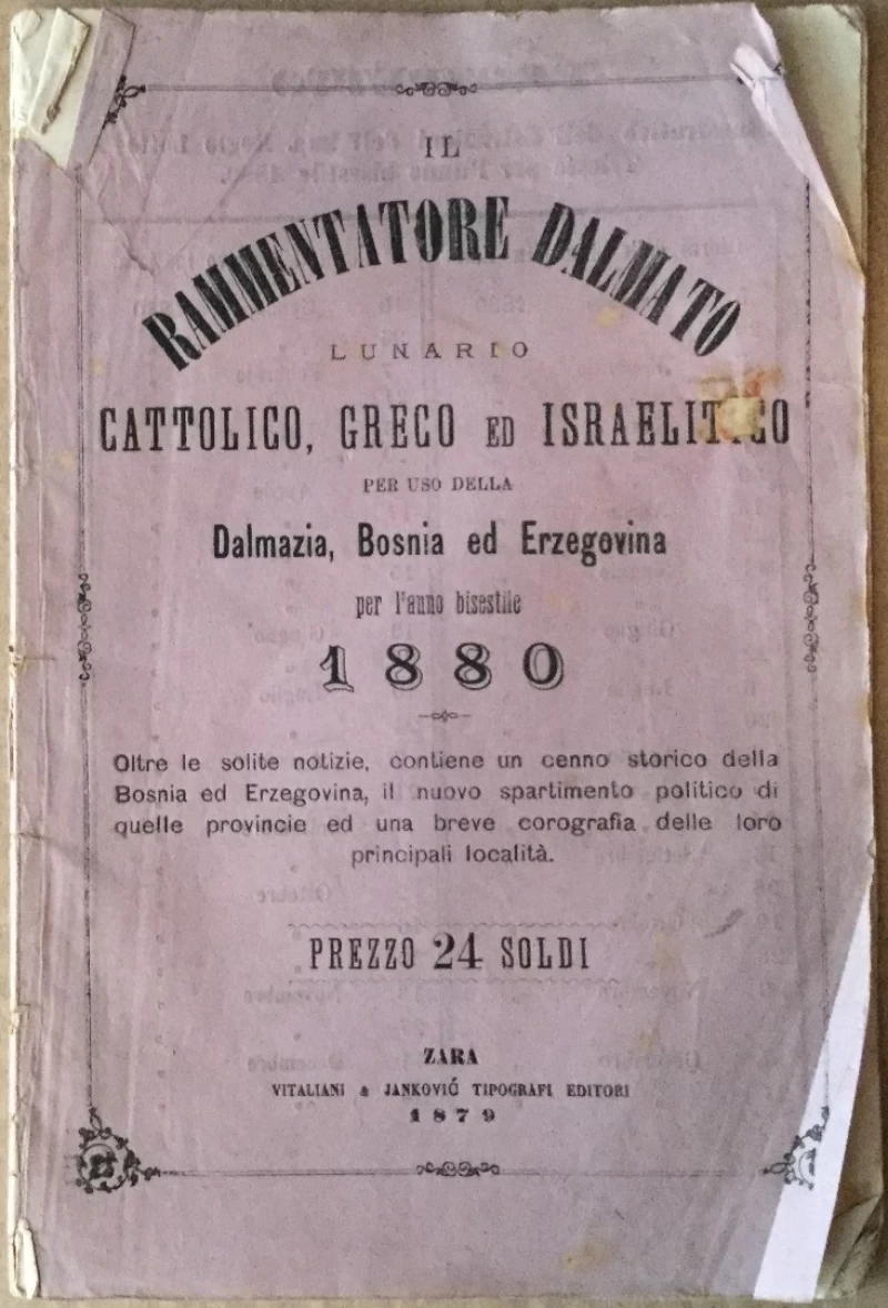 Nepoznati autori: IL RAMMENTATORE DALMATO, LUNARIO CATTOLICO, GRECO ED ISRAELITICO PER USO DELLA DALMAZIA, BOSNIA ED ERZEGOVINA PER L'ANNO BISESTILE 1880