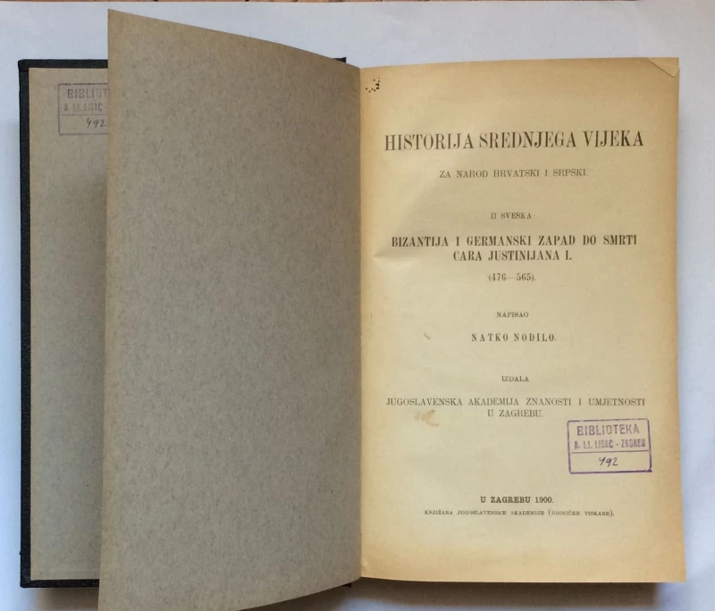 Nepoznati autori: NATKO NODILO, HISTORIJA SREDNJEG VIJEKA ZA NAROD HRVATSKI I SRPSKI, 2.SVESKA-BIZANTIJA I GERMANSKI ZAPAD DO SMRTI JUSTINIJANA PRVOG, ZAGREB, 1900.