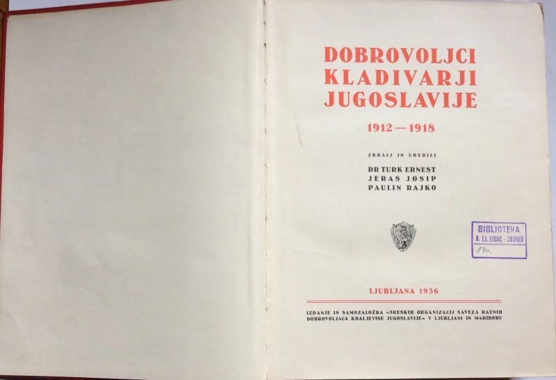 Nepoznati autori: TURK-JERAS-PAULIN, DOBROVOLJCI KLADIVARJI JUGOSLAVIJE 1912-1918, LJUBLJANA, 1936.