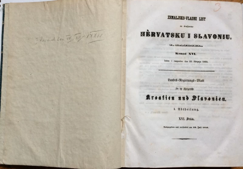 ZEMALJSKI VLADIN LIST ZA KRALJEVINE HRVATSKU I SLAVONIJU, 1. RAZDIJEL, KOMAD 16.1855.