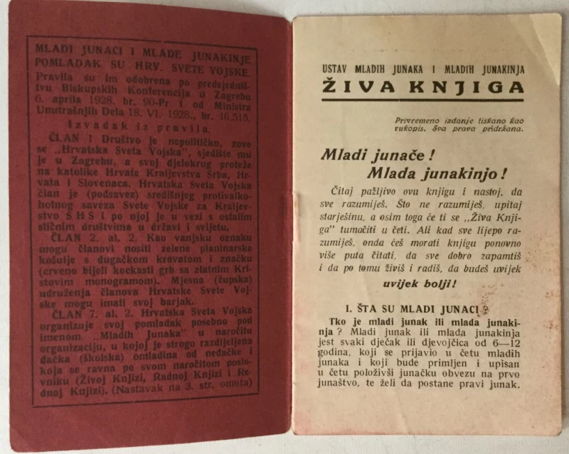 UPUTSTVA ZA ČLANOVE ORGANIZACIJE MLADI JUNACI I MLADE JUNAKINJE, POMLADKA HRVATSKE SVETE VOJSKE. PRAVILA JE ODOBRILO PREDSJEDNIŠTVO BISKUPSKIH KONFERENCIJA U ZAGREBU 6. TRAVNJA 1928. I MINISTAR UNUTRAŠNJIH DELA 18. LIPNJA 1928. GODINE