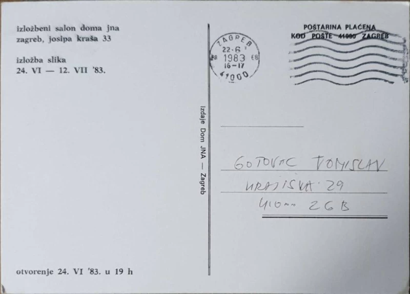 Filip Janković: Izložba slika 24.VI-12.VIII:1983: pošiljatelj Tomislav Gotovac