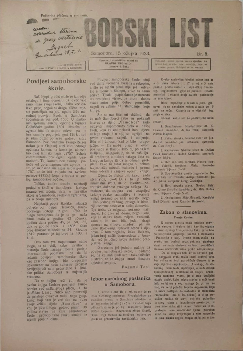 Nepoznati autori: Samoborski List: Broj 6 , 15.03.1923