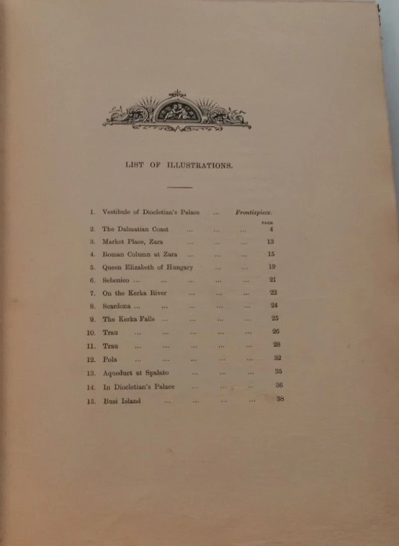 Prvo izdanje. Sadržaj i popis ilustracija na početku knjige. Ilustrirano - 30 cjelostranih litografija u sepija tehnici na umetnutim listovima sa zaštitnom folijom. Vinjeta na naslovnici. Skicozni plan Zadra na str. 14. Originalan tvrdi platneni uvez s raskošnim zlatotiskom na prednjim koricama. Vrlo rijetka knjiga malo poznatog autora teksta i slikara sa zanimljivim opisima obale od Pule do Kotora. Autor je uz dalmatinsku obalu putovao 1899. godine, na poziv prijatelja, na njegovu parobrodu.