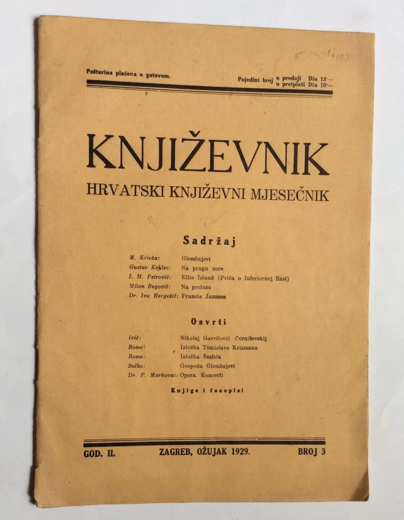 KNJIŽEVNIK, HRVATSKI KNJIŽEVNI MJESEČNIK, BROJ 3, GODINA 1929.
