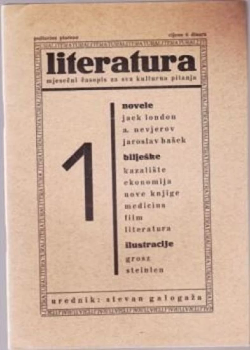 Prvi broj Literature - mjesečnog časopisa za sva kulturna pitanja. Urednik Stevan Galogaža. Vlasnik i izdavač Alfred Neufeld. Sadržaj - Jack London, Nevjerov, Hašek, kazalište, nove knjige, film, literatura... Likovni prilozi Georg Grosz i Théophile Steinlen. Stanje - antikvarno odlično