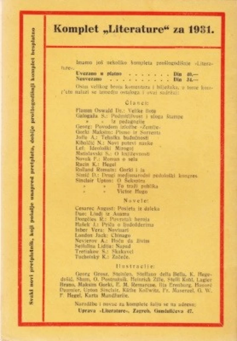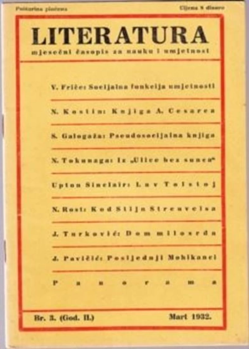 Literatura - mjesečni časopisa za sva kulturna pitanja. Urednik Stevan Galogaža. Vlasnici i izdavači Alfred Neufeld i Stevan Galogaža. Godina 1932. Friče, Kostin, Galogaža, Tokunaga, Upton Sinclair, Rost, Turković, Josip Pavičić. Stanje - odlično