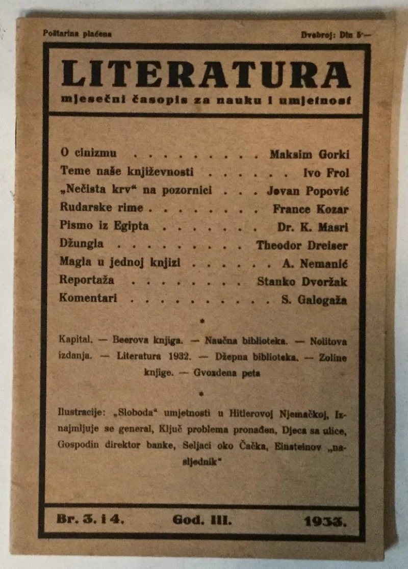 Literatura - mjesečni časopisa za sva kulturna pitanja. Urednik Stevan Galogaža. Vlasnici i izdavači Alfred Neufeld i Stevan Galogaža. Godina 1932. Sadržaj - Maksim Gorki o cinizmu, Ivo Frol, Jovan Popović, Dreiser, Nemanić, Galogaža. Sjajne Ilustracije - Sloboda umjetnosti u Njemačkoj, Iznajmljuje se general, Ključ problma pronađen, Gospodin direktor banke... Stanje - odlično