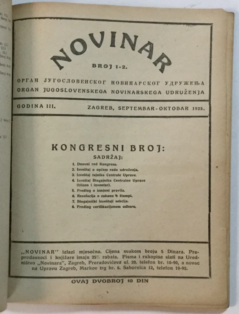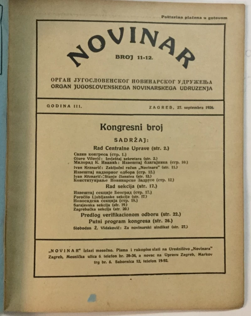 Ivan Krznarić (ur.): Novinar, Organ Jugoslovenskog novinarskog udruženja, brojevi 1-12 godina III. 1925/26.