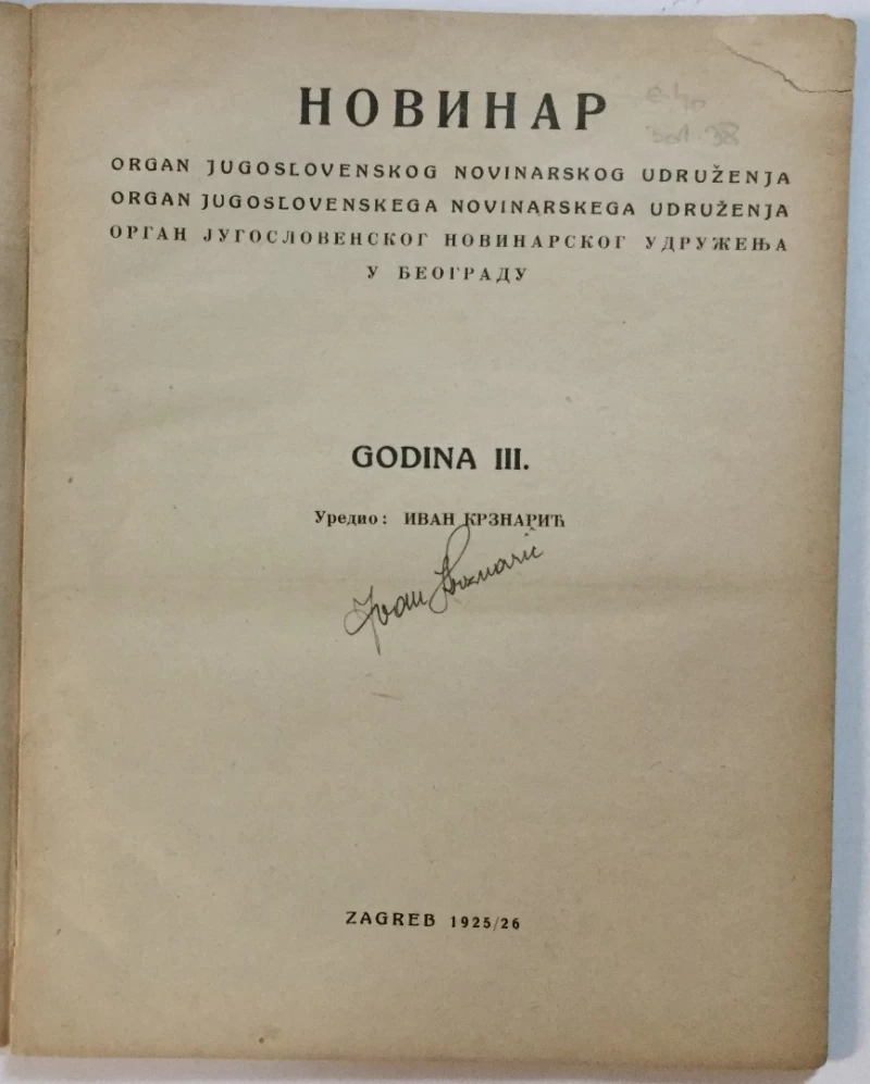 Krznarić (ur.) Ivan: Ivan Krznarić (ur.): Novinar, Organ Jugoslovenskog novinarskog udruženja, brojevi 1-12 godina III. 1925/26.