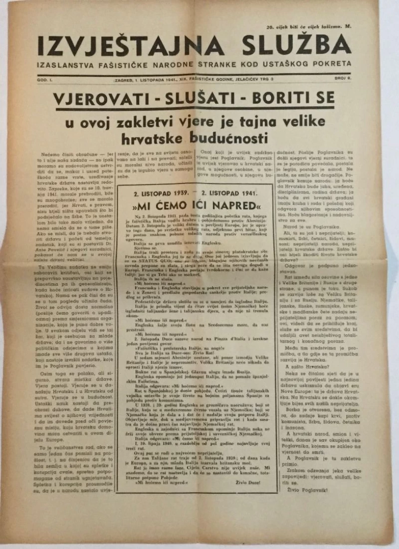 Nepoznati autori: NOVINE IZVJEŠTAJNA SLUŽBA FAŠISTIČKE NARODNE STRANKE KOD USTAŠKOG POKRETA BROJ 7 GODINA 1941