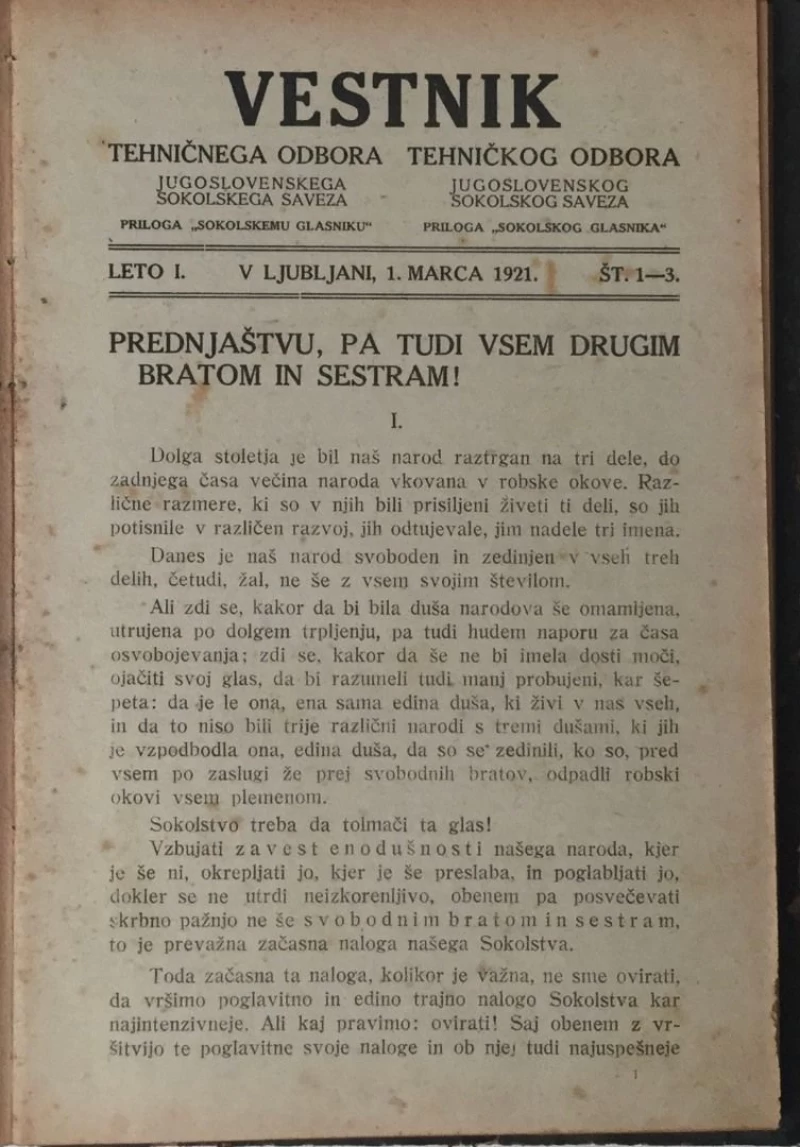 Nepoznati autori: VESTNIK TEHNIČKEGA ODBORA JUGOSLOVENSKEGA SOKOLSKOG SAVEZA , BROJ 1-12 GODINA PRVA , 1921.