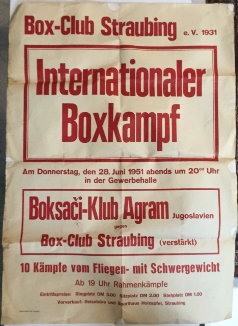 Sportski plakat Internationaler Boxkampf, Boksački klub Agram gegen Box-Club Straubing, 1951. godina