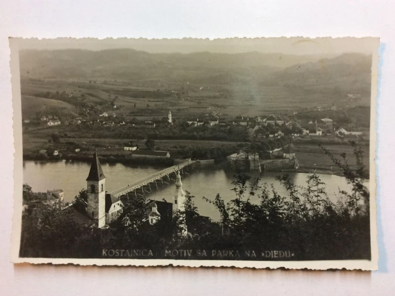 HRVATSKA KOSTAJNICA STARA RAZGLEDNICA PANORAMA UTVRDA MOST ZVONICI MOTIV S PARKA NA "DJEDU" 1940.