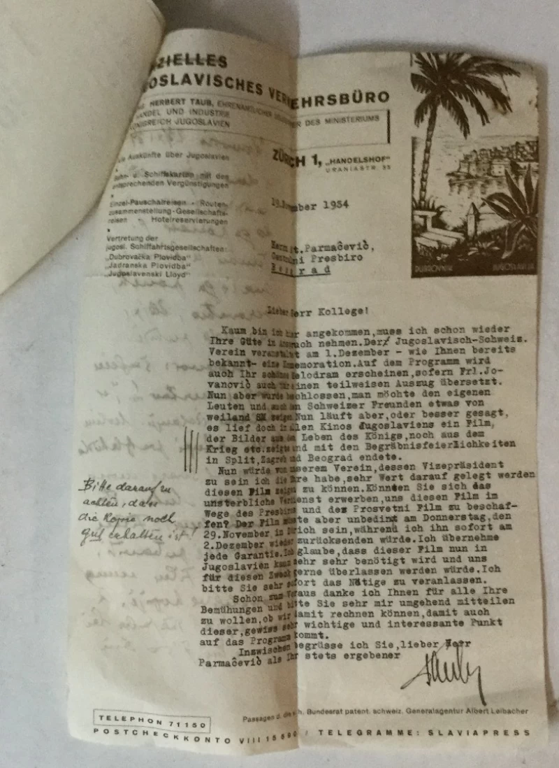 Sadržaj:Herbert Taub, počasni predstavnikšvicarskog Ministarstva trgovine i industrije u Kraljevini Jugoslaviji, poslao je 19. i 21. studenog dva pisma adresirana na Stjepana Parmačevića u Centralnom Presbirou u Beogradu. U prvom pismu raspituje se o filmu o životu, smrti i dočeku posmrtnih ostataka kralja Aleksandra u Splitu, Zagrebu i Beogradu nakon atentata u Marseilleu (pisma su pisana nešto više od mjesec dana nakon atentata) kako bi se film mogao prikazati u Švicarskoj. U drugom pismu raspituje se i o komemorativnim zlatnicima iskovanima nakon atentata.