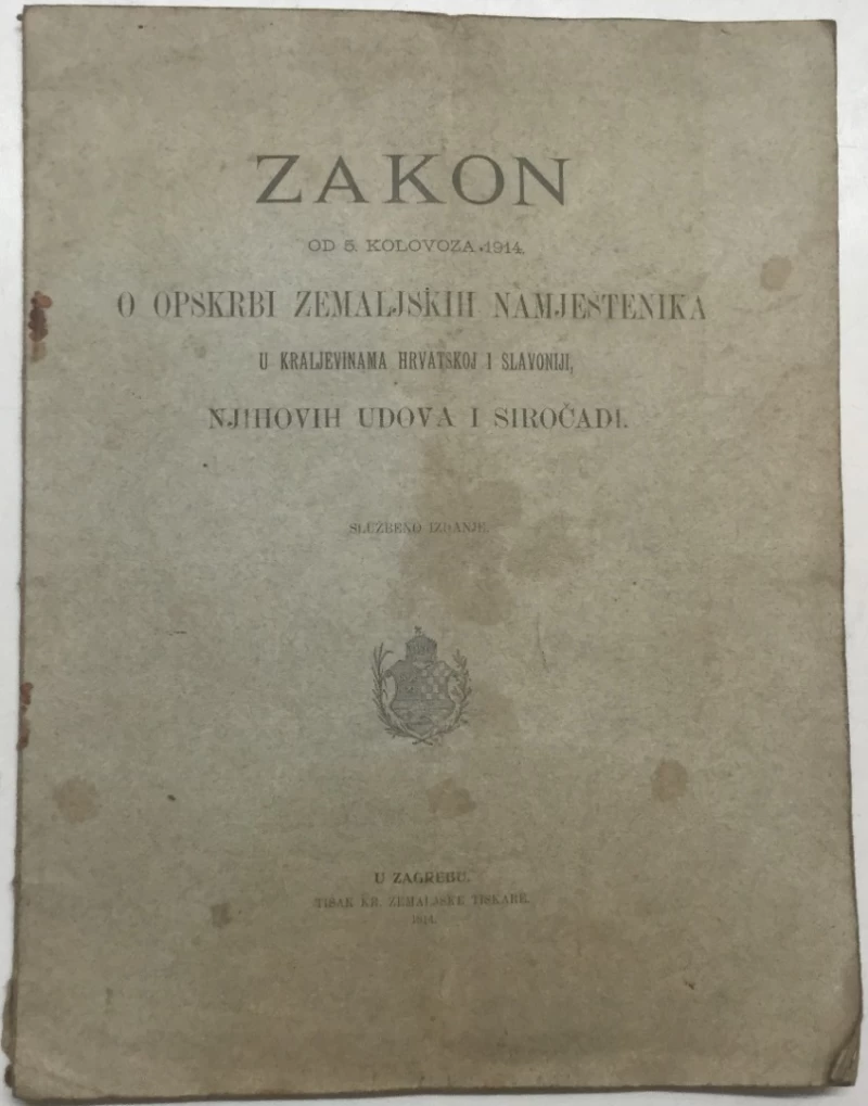 Nepoznati autori: ZAKON OD 5. KOLOVOZA 1914. O OPSKRBI ZEMALJSKIH NAMJEŠTENIKA U KRALJEVINAMA HRVATSKOJ I SLAVONIJI, NJIHOVIH UDOVA I SIROČADI